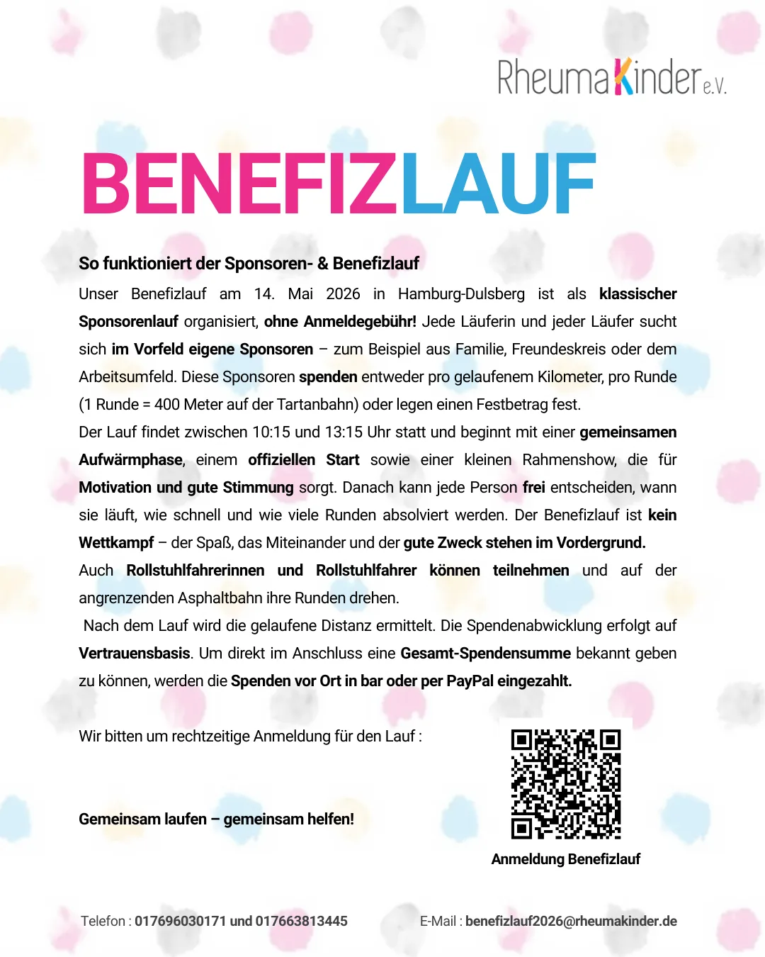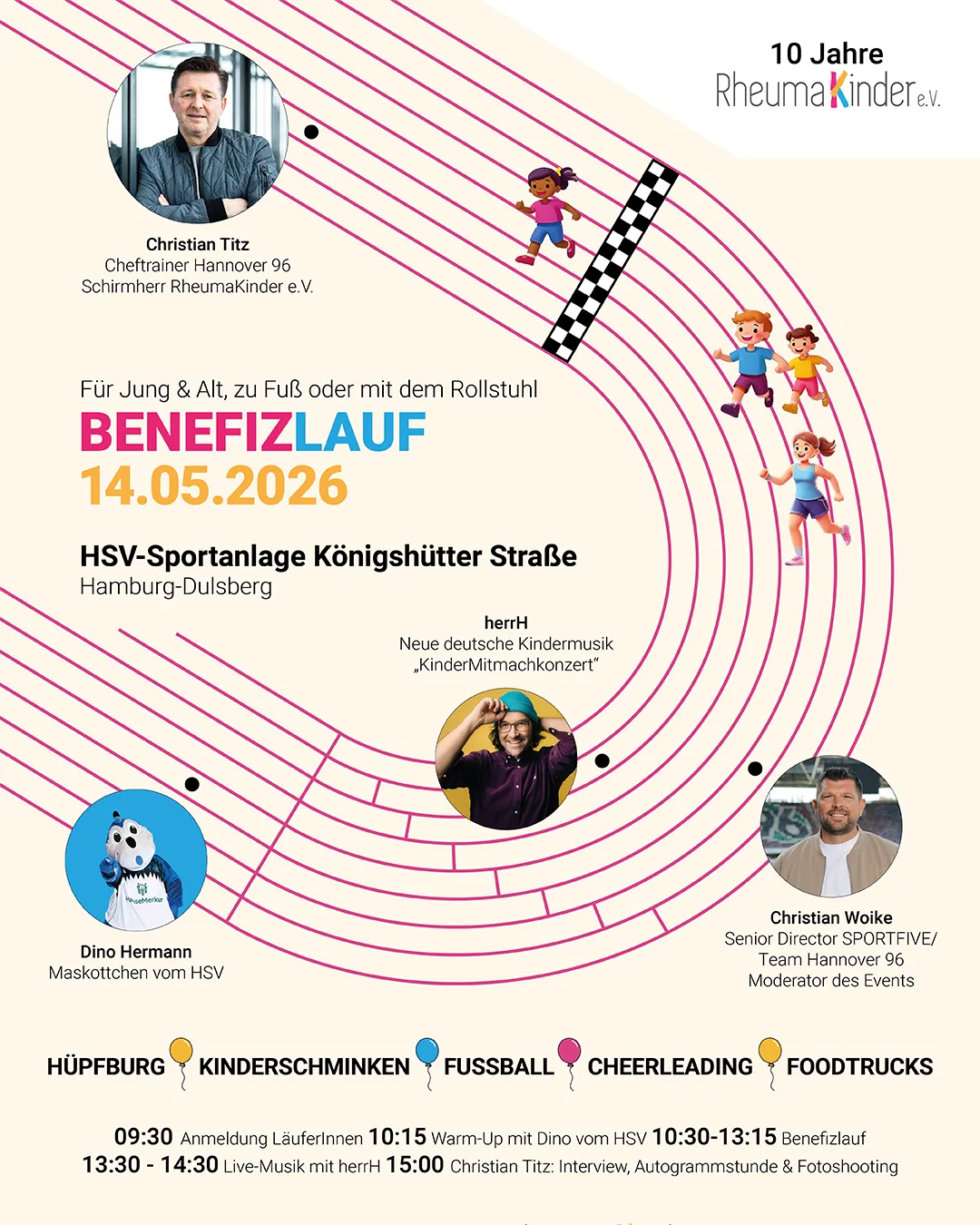 Am 14. Mai 2026 veranstalten wir auf dem HSV-Sportplatz Königshütter Straße in Hamburg einen großen Benefizlauf zugunsten von RheumaKinder e.V.. Ziel der Veranstaltung ist es, Aufmerksamkeit für rheumatische Erkrankungen bei Kindern und Jugendlichen zu schaffen und gleichzeitig Spenden für die wichtige Arbeit des Vereins zu sammeln. Als Schirmherr unterstützt uns Christian Titz, Cheftrainer von Hannover 96, und wir erwarten 3.000 bis 4.000 Gäste, die gemeinsam für den guten Zweck laufen, anfeuern und die Veranstaltung genießen. Neben dem Lauf erwartet die Besucherinnen und Besucher ein buntes Rahmenprogramm mit Tombola, Aktionen für Familien und weiteren Highlights. Der gesamte Erlös kommt RheumaKinder e.V. zugute und unterstützt Projekte, die betroffenen Kindern und ihren Familien helfen. Alle Interessierten sind herzlich eingeladen – ob als Läuferinnen und Läufer, Unterstützer oder Gäste. Gemeinsam möchten wir ein starkes Zeichen für Solidarität, Bewegung und Hilfe für rheumakranke Kinder setzen.