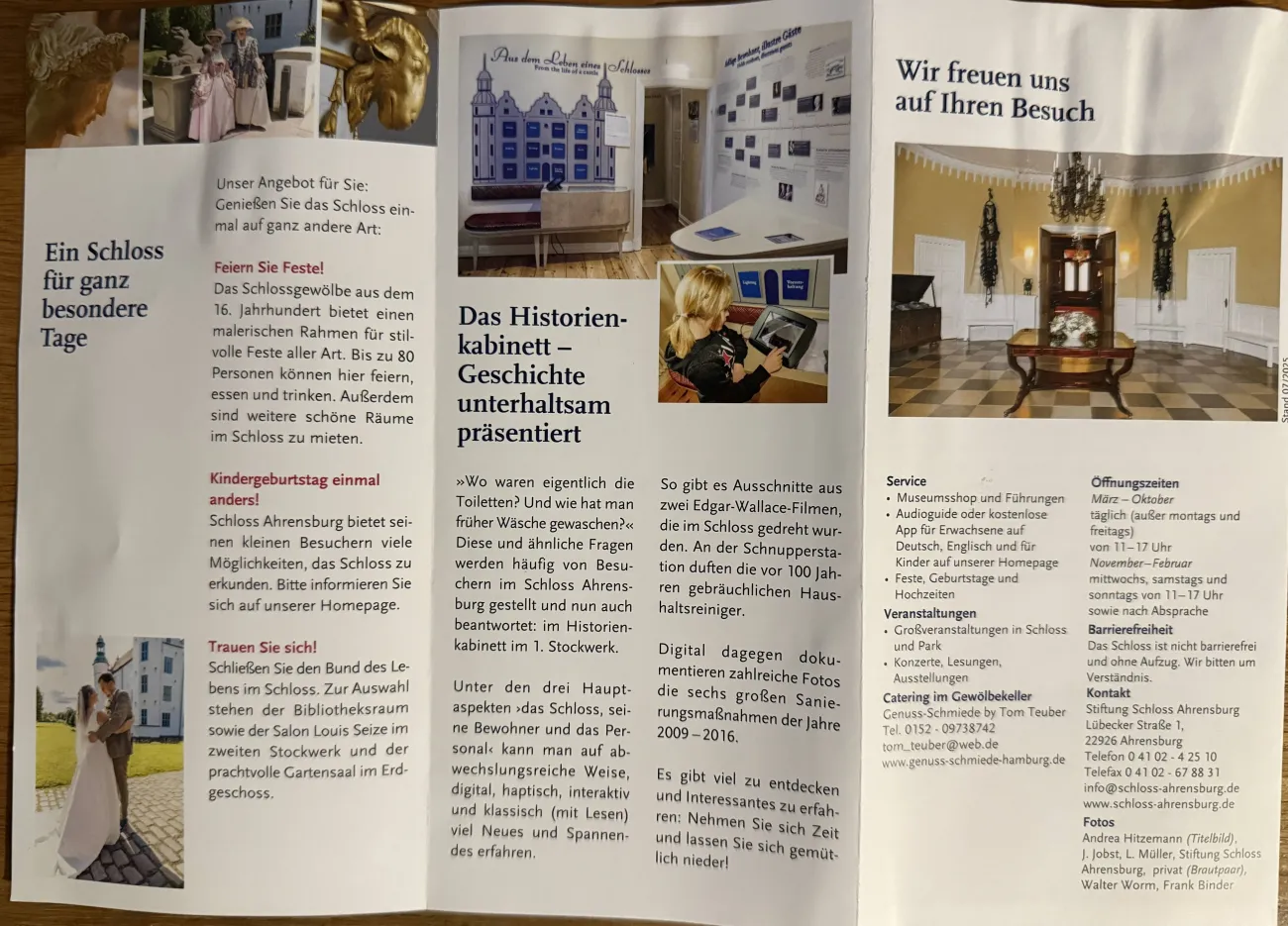 Von Hamburg aus ist das Schloss bequem in rund 30 Minuten erreichbar – entweder mit dem Auto über die A1 (Ausfahrt Ahrensburg) oder mit der Regionalbahn Richtung Lübeck. Vom Bahnhof Ahrensburg fährt ein Bus bis fast direkt vor das Schloss. Kostenfreie Parkplätze stehen in der Nähe zur Verfügung.