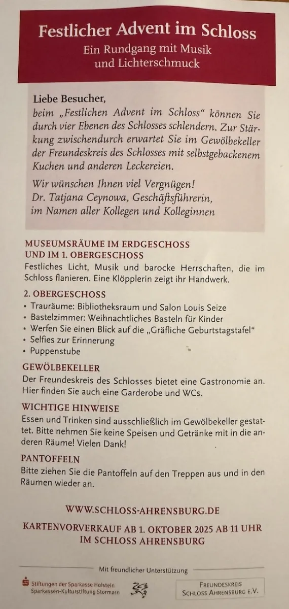 Das „Schloss im Advent“ in Ahrensburg ist ein märchenhaftes Erlebnis, das Geschichte, Musik und weihnachtliche Stimmung harmonisch vereint. Zwischen Rokoko-Glanz, Musik und Handwerkskunst lässt sich die Vorfreude auf das Fest in ganz besonderer Atmosphäre genießen – ein Besuch, der Jahr für Jahr verzaubert.