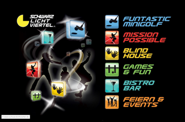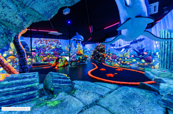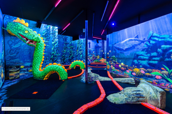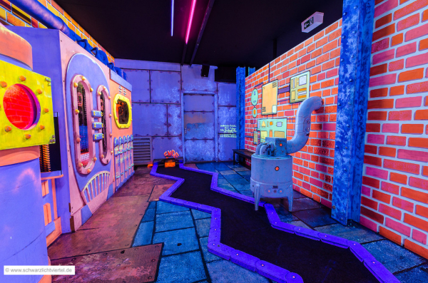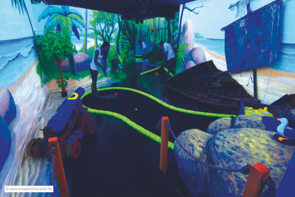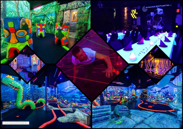 Minigolf-Fans aufgepasst! Wer aus dem beliebten Freizeitspaß mehr herausholen möchte, ist im Schwarzlichtviertel an der richtigen Adresse. Schubst den Ball in völlig neuer Umgebung ins Loch und begebt euch auf eine beleuchtete Erlebnisreise. Außerdem könnt ihr im schwarzlichtviertel noch die anderen Attraktionen wie Virtual Reality, den Laser Parcout sowie den Laser Hunt und diverse andere Spiele wie Schwarzlicht Airhockey oder Schwarzlicht Billardausprobieren.