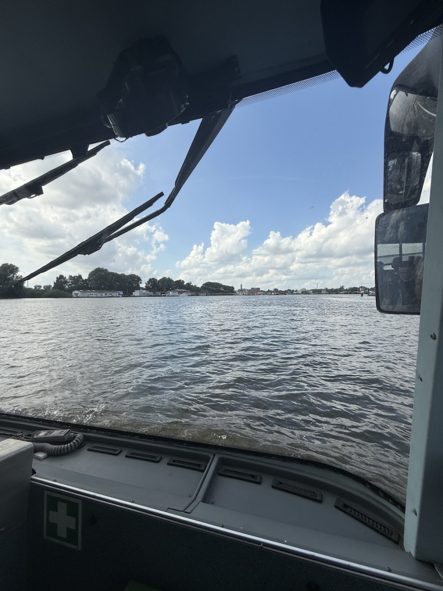 Auf dem Wasser: Rund 30 Minuten fährt der RiverBus über die Elbe, vorbei an der Billwerder Bucht und dem Sturmflutsperrwerk.